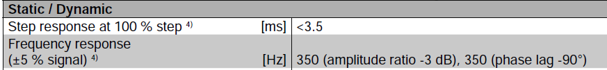 從圖中即可看到控制信號為5%時,幅頻響應及相頻響應特性都為350Hz;這從樣本參數(shù)表里也得到驗證,350Hz的頻響特性已經達到甚至超過了部分伺服閥的性能。