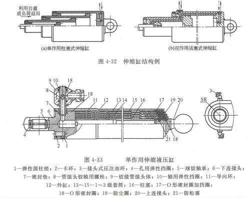 伸縮式液壓缸具有二級或多級活塞,伸縮式液壓缸中活塞伸出的順序式從大到小,而空載縮回的順序則一般是從小到大。伸縮缸可實現較長的行程,而縮回時長度較短,結構較為緊湊。此種液壓缸常用于工程機械和農業機械上。有多個一次運動的活塞,各活塞逐次運動時,其輸出速度和輸出力均是變化的。
